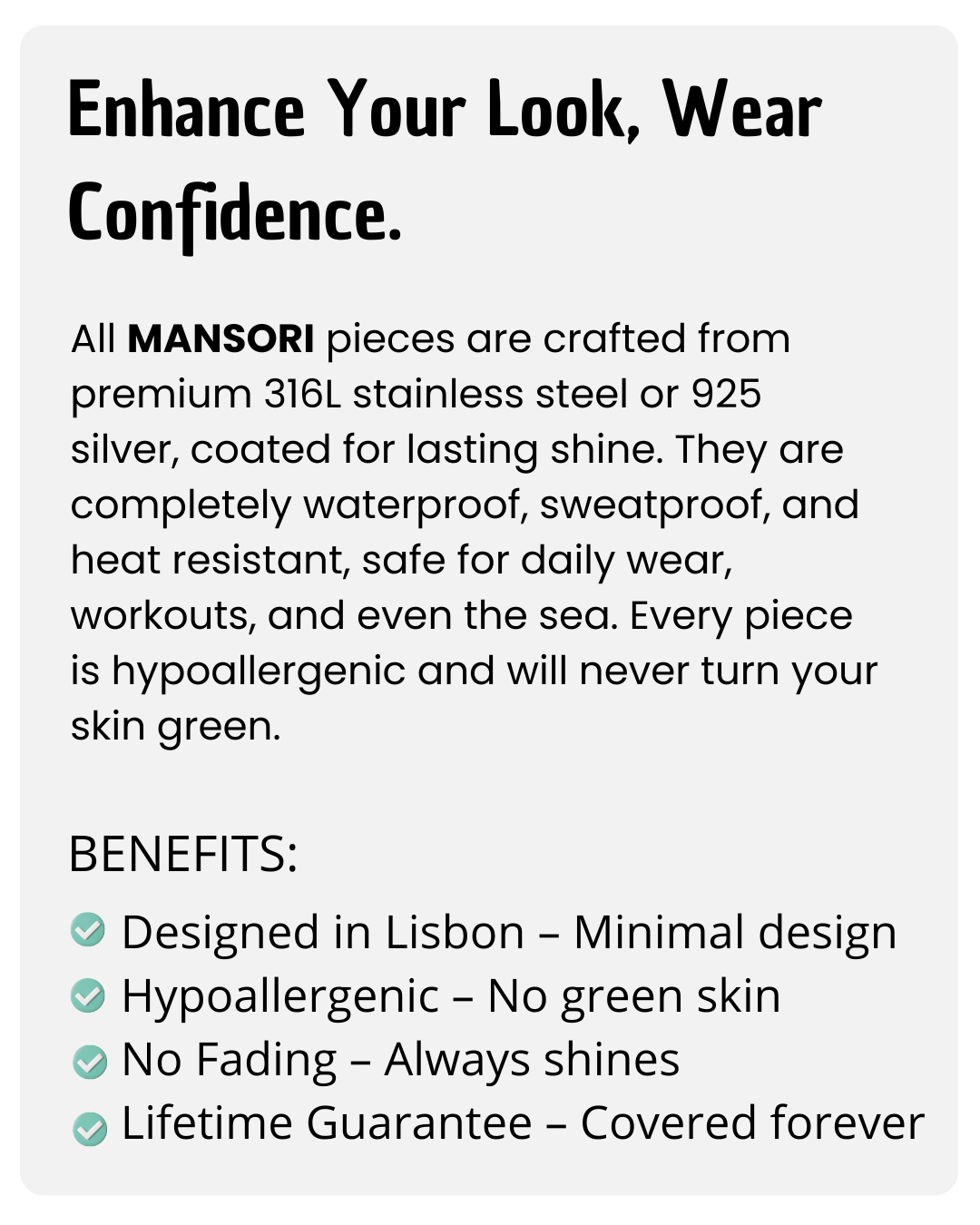 All MANSORI jewelry is made from premium 316L stainless steel and 925 silver, two of the toughest materials available. Each piece is plated with ultra-resistant gold and coated with a durable anti-tarnish finish that locks in shine, keeps it looking fresh permanently, and ensures it will not change color.